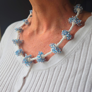 Embrace the beauty of the sea with this uniquely textured necklace. Inspired by the intricate forms of coral and swaying seaweed, its shades of blue bring the ocean to life. Perfect for adding an artistic touch to beach days, summer parties, or any occasion where you want to stand out with natural elegance.